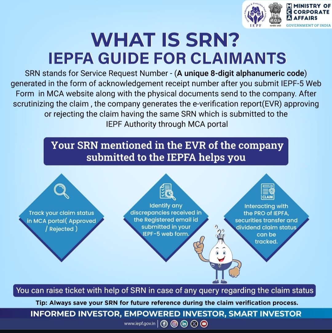 • Communication: Any queries, discrepancies, or updates from IEPFA officials are linked to your SRN.